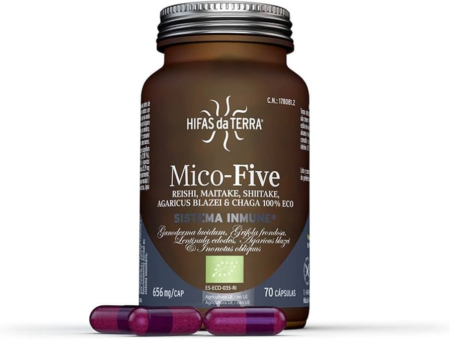 – Sustancias bioactivas: α y β-glucanos, triterpenos, adenosina y manitol. Mico-Five es una fuente natural de vitamina D y zinc.